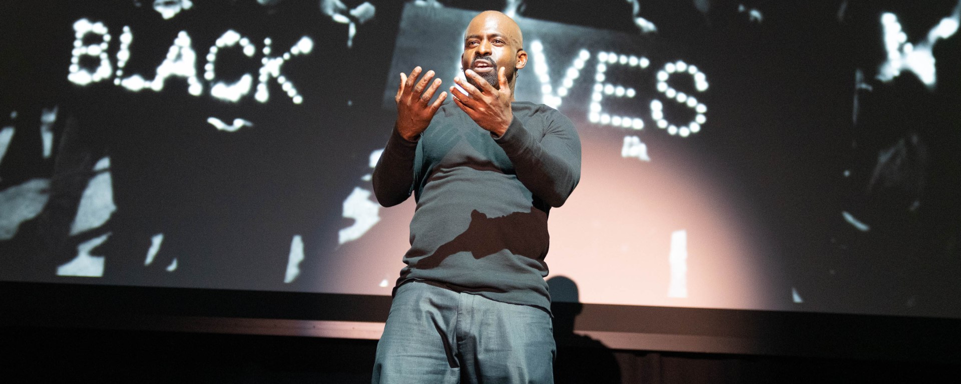 Lyrics From Lockdown is a groundbreaking multimedia theater production, exposing the unresolved contradictions of prisons and policing in America. Weaving together over 40 voices, including California choirboy Nanon Williams, who was sentenced to Death Row in Texas at 17, an immigrant family in Brooklyn, and a wrongfully incarcerated Harvard Law student, this unforgettable performance is a one-man tour de force. Fusing hip hop theater, spoken word poetry, comedy, calypso, and blues — with a live band and video DJ — this extraordinary production exposes systemic injustice in the nation incarcerating more people than any other in the world.