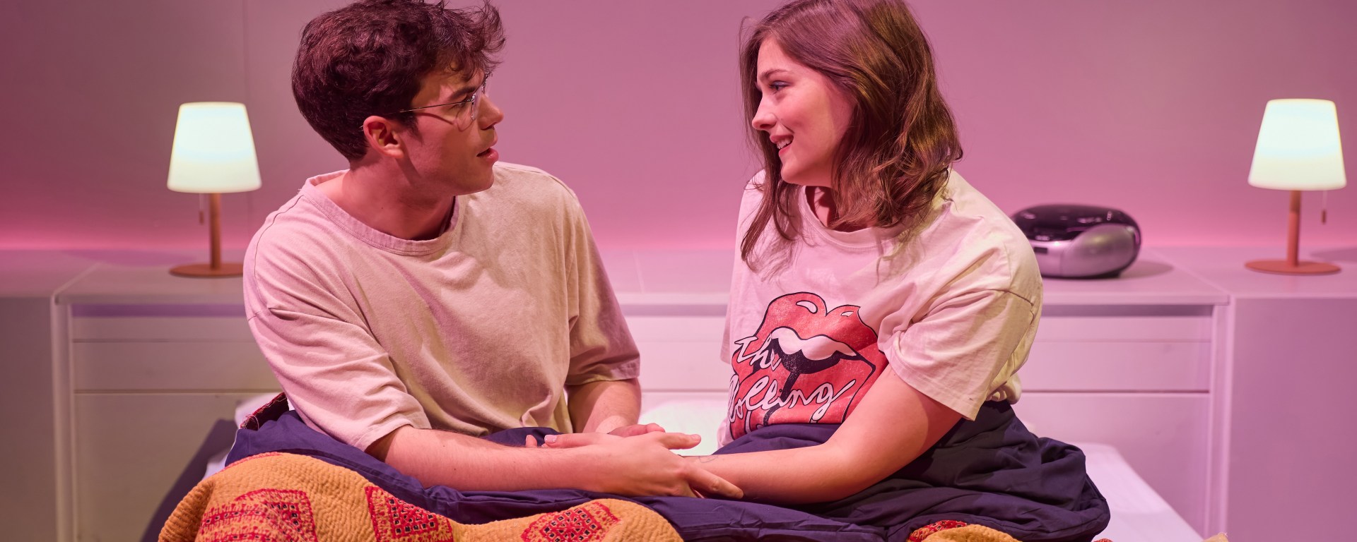 The production is led by Bridgerton star, Luke Newton and Amber Anderson, who makes her stage debut with a tour de force performance. Anderson is enigmatic and makes a logical case for her character’s actions while also showing no guilt or remorse. Newton is charming as an English lit major whose romantic inexperience fuels his desire to please Evelyn. He also shows an edgier side when he confronts her at the end. The two have clear chemistry, making the dynamic and Adam’s actions for her more believable.