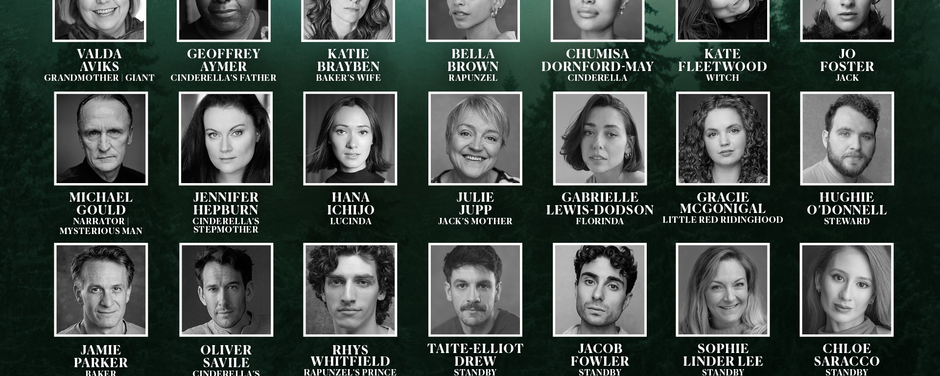 Taking to the stage will be Valda Aviks (The Addams Family Musical – original UK tour) as Grandmother/Giant, Geoffrey Aymer (The Wizard of Oz – London Palladium) as Cinderella’s Father, Katie Brayben (Tammy Faye – Broadway & Almeida; Olivier Award for Best Actress in a Musical) as the Baker’s Wife, Bella Brown (Evita – London Palladium) as Rapunzel, Chumisa Dornford-May (Natasha, Pierre and The Great Comet of 1812 – Donmar Warehouse; Olivier Award nomination for Best Actress in a Musical) as Cinderella, Kate Fleetwood (London Road – National Theatre; Olivier Award nomination for Best Actress in a Musical) as the Witch, Jo Foster (Why Am I So Single? – Garrick Theatre) as Jack, Michael Gould (Oedipus – Wyndham’s Theatre) as the Narrator/Mysterious Man, Jennifer Hepburn (Mamma Mia! – Novello Theatre) as Cinderella’s Stepmother, Hana Ichijo (The Baker’s Wife – Menier Chocolate Factory) as Lucinda, Julie Jupp (A Christmas Carol – Old Vic) as Jack’s Mother, Gabrielle Lewis-Dodson (42nd Street – Theatre Royal Drury Lane) as Florinda, Gracie McGonigal (The Little Big Things – Soho Place) as Little Red Ridinghood, Hughie O’Donnell (King Lear – Wyndham’s Theatre) as the Steward, Jamie Parker (Harry Potter and the Cursed Child – Palace Theatre; Olivier Award for Best Actor in a Play) as the Baker, Oliver Savile (Wicked – Apollo Victoria) as Cinderella’s Prince/Wolf and Rhys Whitfield (The Phantom of the Opera – His Majesty’s Theatre) as Rapunzel’s Prince.